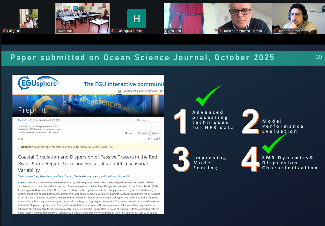 Her research focused on the dynamics of SMS currents in two Vietnamese coastal regions: the deep coastal waters of Central–Southern Vietnam and the shallow waters around the Red River estuary in the Gulf of Tonkin. In the Red River estuary area, the research team employed high-frequency (HF) radar and advanced processing techniques to collect high-quality surface current data. These data helped clarify seasonal and intra-seasonal variations of SMS processes, as well as the impacts of small-scale dynamics on the dispersion of suspended and dissolved materials in coastal waters. Overall, the study demonstrates that HF radar is highly effective for monitoring coastal currents and significantly enhances understanding of submesoscale current variability and material transport processes in different Vietnamese coastal regions.