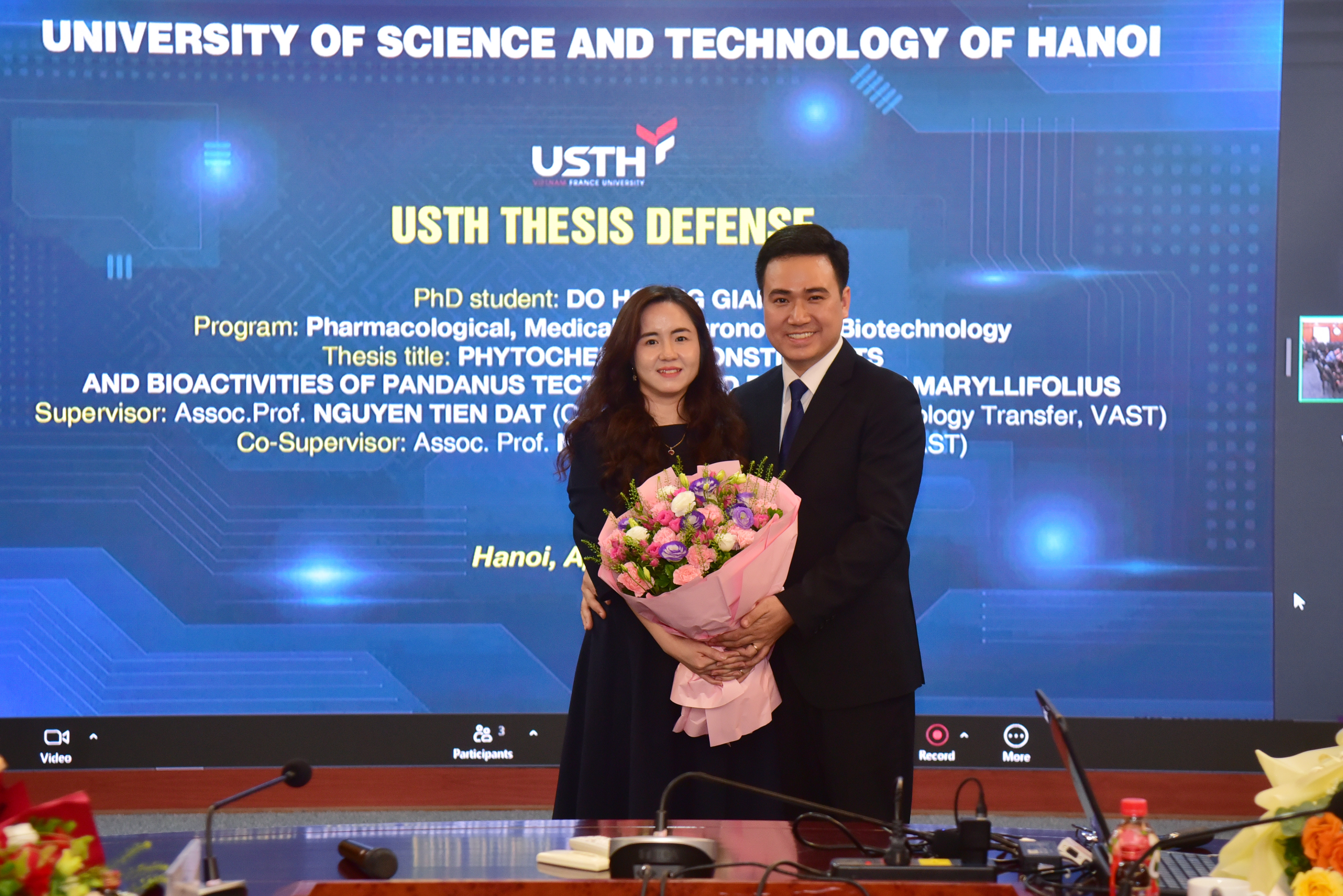 Ngày 24/04/2026, Trường Đại học Khoa học và Công nghệ Hà Nội (USTH) đã tổ chức Lễ bảo vệ luận án tiến sĩ cho nghiên cứu sinh (NCS) Đỗ Hoàng Giang, ngành Công nghệ Sinh học nông, y, dược (Pharmacological, Medical and Agronomical Biotechnology), mã số 9420201, với đề tài: “Phytochemical constituents and bioactivities of Pandanus tectorius and Pandanus amaryllifolius / Nghiên cứu thành phần hóa học và hoạt tính sinh học của loài dứa dại (Pandanus tectorius) và loài dứa thơm (Pandanus amaryllifolius)”.